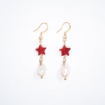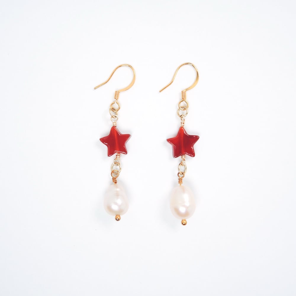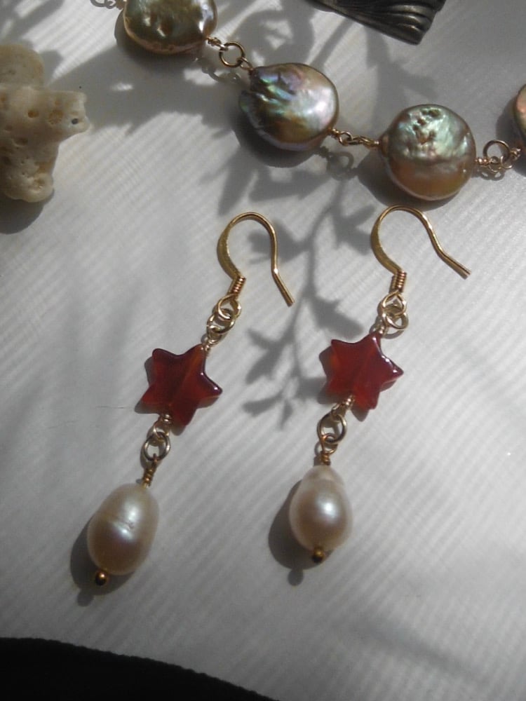 A dainty cascade of freshwater cultured pearls and carved carnelian stars.