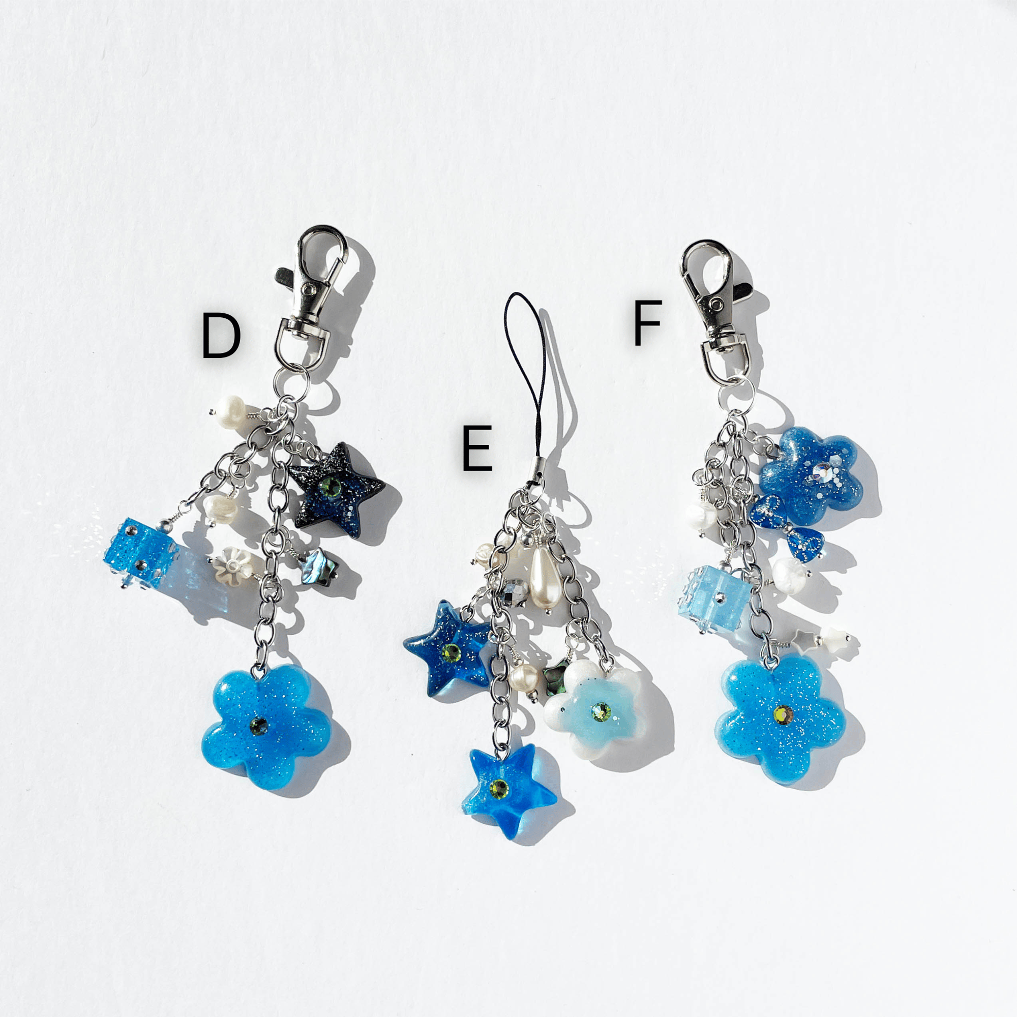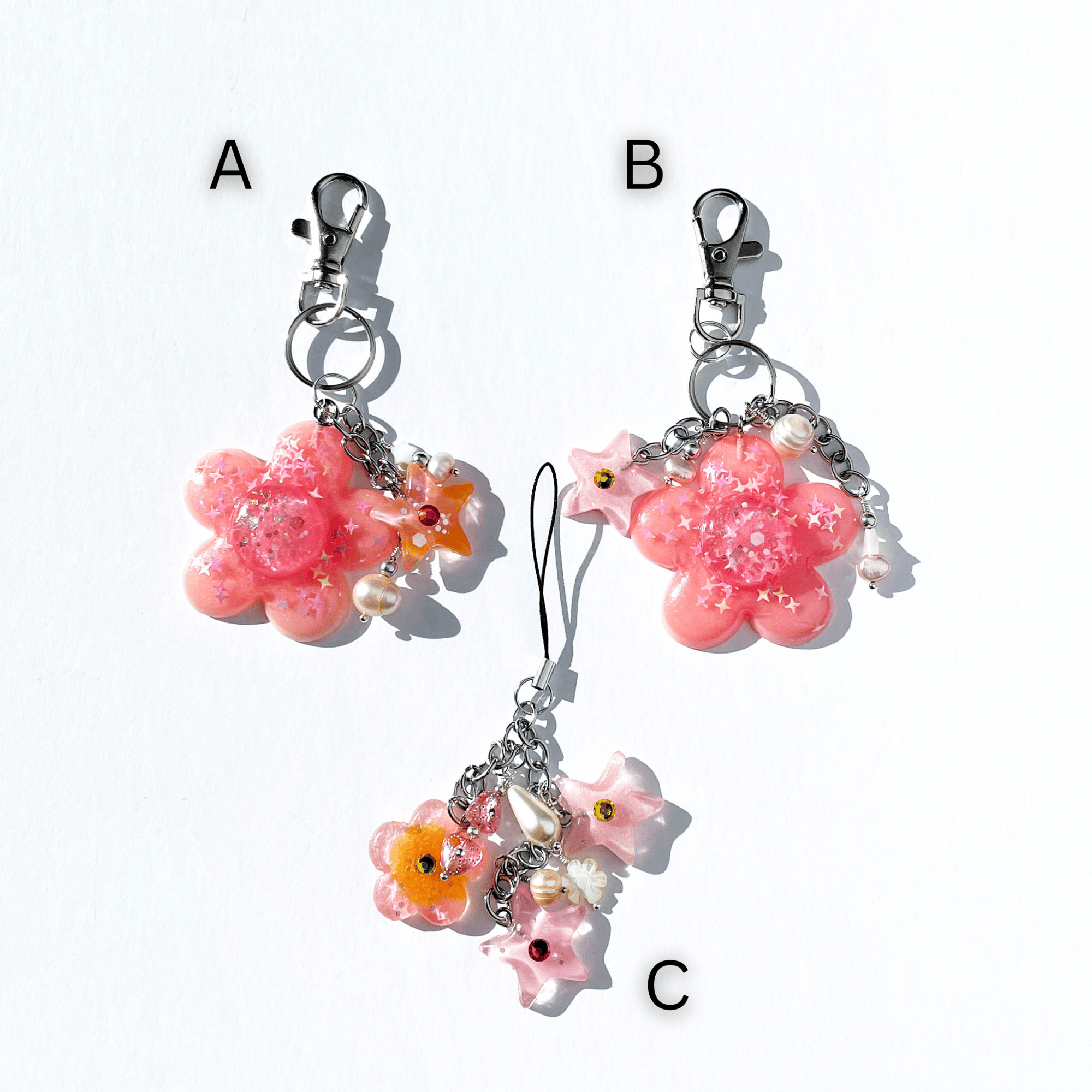 Handmade keycharms made using custom molded resin flowers, resin stars, freshwater pearls and vintage beads.